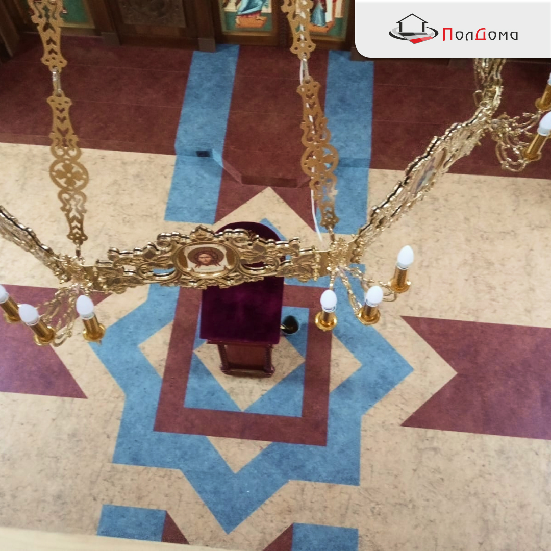 Подобрали ПВХ - плитку LG в храме. Основанием служила фанера, а схема укладки включала декоративную резку с индивидуальным рисунком. Покрытие подчеркнуло атмосферу уюта и торжественности, став гармоничным элементом храмового интерьера.