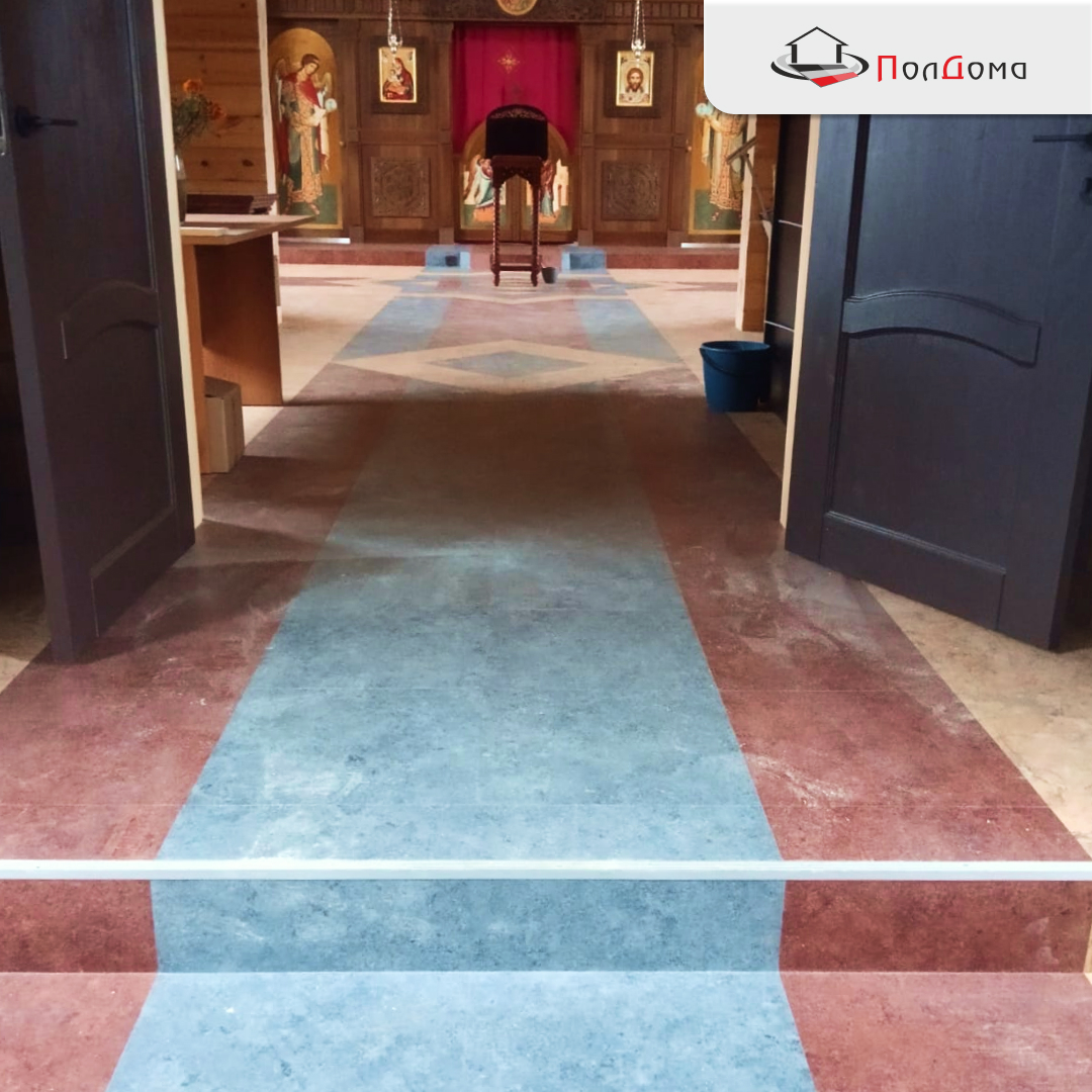 Монтаж выполнял строитель со стороны. Основанием послужила прочная фанера, обеспечивающая стабильность и ровность поверхности. Главным декоративным акцентом стала схема укладки с резкой и рисунком — индивидуальный узор, созданный специально под интерьер храма. Такое решение позволило подчеркнуть торжественность помещения и при этом сохранить практичность эксплуатации.
